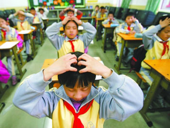 十一長(zhǎng)假過(guò)后,西四北四條小學(xué)的學(xué)生就開始學(xué)做新版眼保健操了。多數(shù)老師都認(rèn)為新版眼保健操動(dòng)作簡(jiǎn)單易學(xué),而且增加了腳趾活動(dòng)和按壓頭部的內(nèi)容,比過(guò)去有不少進(jìn)步。但新操中“腳趾抓地”這樣的隱蔽動(dòng)作,不會(huì)脫了鞋檢查,不容易監(jiān)督。