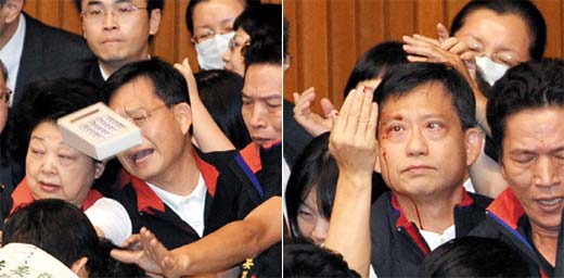 據“中央社”報道,臺灣“立法院”臨時會昨天下午處理兩岸經濟合作架構協議(ECFA)徑付二讀時,藍綠發生推擠沖突,混亂中,吳育升遭定時器砸中。國民黨團昨晚召開記者會,調出錄影帶顯示是黃偉哲所砸。