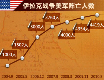 在攻打伊拉克的大規(guī)模軍事行動中,美軍只有138名軍人喪生。但此后美軍頻繁遭到伊拉克境內(nèi)反美武裝的襲擊,傷亡人數(shù)不斷攀升。截至2010年8月16日,駐伊美軍死亡總數(shù)已達(dá)4415人,另有約3.2萬人在戰(zhàn)斗中受傷。龐大的軍費開支也給美國經(jīng)濟(jì)造成沉重負(fù)擔(dān)。截至2010年8月19日,美國用于伊戰(zhàn)的開支已達(dá)7423億美元,平均每天耗費2.75億美元。