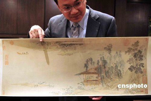 圖為預料成交價超過一千二百萬港元的仇英名作《采蓮圖》,這幅精美的手卷曾被清朝乾隆皇帝收藏。中新社發 譚達明 攝