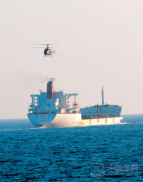 中國(guó)海軍護(hù)航編隊(duì)特戰(zhàn)隊(duì)員乘坐艦載直升機(jī)從“振華13”號(hào)貨輪上返回。錢曉虎 攝