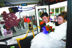 昨日,兩輛公交車成了一對新人的“重量級”婚車。新郎于浩是公交車司機,新娘賈春穎是公交站調度員。新郎抱著新娘上車時,司機說“先生請刷卡”。