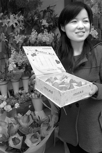 不過,在成都財富中心某公司工作的王宏新在訂下一束花后,當即向老板詢問是否可以訂貨,還對老板的這個創意大加贊賞,并提出了自己的一些改進觀點。他說,其實,情人節,大家過的就是一個情調,只要看起來不錯,女朋友喜歡,買一份倒也是可以的!澳昴晁兔倒濉⑶煽肆,今年來點新鮮的,送盒草莓,也許更討人喜歡!币幌,引來眾人大笑。