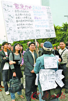 漫畫家名為黃達沖,在天河體育中心南門廣場舉著一面與他身高差不多的鐵牌,上面展示了他的“三國英雄前傳”漫畫以及他的宣言:“盲流行動·賣稿賣身一千萬……”他一身牛仔套裝上前身后背也貼著多張漫畫作品,引得路人圍觀。何謂“盲流”?他解釋道,他是南寧人,來廣州十年,做過出版和媒體工作,現在快40歲了,還沒找到方向,所以認為自己是盲流。“我去年11月開始創作‘三國英雄前傳’,現在完成了一半,今天來到這里想找人投資。如果有誠意的話,私下談價錢……一千萬嘛,不一定是人民幣。”在旁邊還有一位長發壯漢,是黃達沖的“哥們”,也是一位“自由藝術家”,正幫著他派傳單。