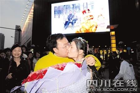 晚上7點,身穿灰色裙子的鄭小姐按照與男友的約定,準點來到影城門口,突如其來的幸福把她完全驚呆了,她甚至沒來得及說一句話,只是眼里含著淚水點了點頭。求婚成功的周先生突然起身,激動地抱住女朋友擁吻,四周圍觀的人群也爆發(fā)出一陣叫好聲。