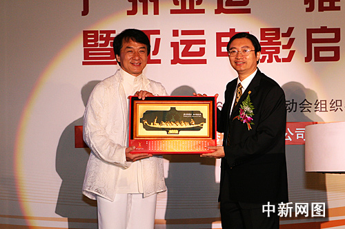 廣州亞組委宣傳部部長、廣州市委宣傳部副部長羅京軍向成龍贈送亞運紀念品