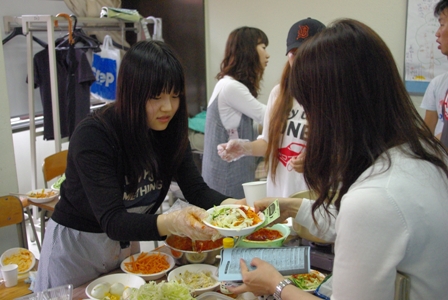 活動當天一大早,中國留學生就已經開始了如火如荼的準備。洗菜、準備食材、布置會場……為了能讓來訪的客人得到最好的體驗,大家都一絲不茍地進行準備。翼路學園2號館4樓主要是各國風味料理的品嘗區(qū)。快到11點,整個樓層彌漫著各種食物的香味。其中的特色食品包括有春卷、餃子、炸醬面還有韓國冷面等。11點活動開始以后各種買賣聲,吆喝聲不絕入耳,非常熱鬧。大家也都排隊耐心等待自己想要品嘗的食物。2號館5樓的內容比較豐富,有自由交易市場,各國的飲食文化介紹說明,中國的地域文化以及方言的說明。在韓國傳統(tǒng)服飾的展覽區(qū),你不僅可以看到各種彩色的韓國傳統(tǒng)服飾照片,還能實際穿上這些學生帶來的傳統(tǒng)韓國服飾,拍下照片,留下紀念。在表演日本的傳統(tǒng)節(jié)目“落語”時,大家都聚精會神地聽著臺上繪聲繪色的演出。
