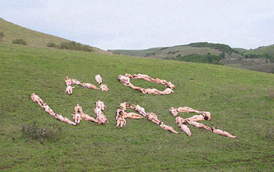 這些為和平呼吁的婦女已經(jīng)擺過(guò)七次造型,供媒體進(jìn)行拍攝。她們?cè)?jīng)在一處海灘用裸體拼寫過(guò)“和平”一詞;還有一次她們?cè)诩永D醽喼莸囊惶庌r(nóng)場(chǎng)的山坡上拼寫“不要戰(zhàn)爭(zhēng)”的口號(hào)。