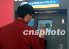十七日,上海正式打響為期四十天的“春運保衛戰”。為緩解春運期間旅客售票難的問題,上海推出“鐵路客票自動售票機”,一位旅客應用電腦觸摸信息購票。作者:湯彥俊