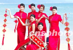 身著大紅旗袍的新絲路名模甄妮、賈妮妮、李彬、杜鵑(后排從右至左),二零零一年世界小姐第五名李冰(前右)、二零零二年世界小姐第五名吳英娜(前左),二十二日在海南亞龍灣向全國人民拜大年,祝愿農(nóng)歷羊年吉祥如意。作者:毛建軍