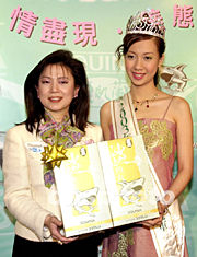 「2003年度國際華裔小姐競選」獲獎佳麗1月26日在香港出席贊助商頒獎儀式,應屆國際華裔小姐冠軍陳泳錦接受贊助商頒贈禮品。