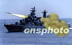 中央軍委授予海軍哈爾濱艦“海上先鋒艦”榮譽稱號命名大會二十六日在青島某軍港舉行。海軍哈爾濱艦是中國國產某新型導彈驅逐艦首艦。圖為哈爾濱艦發射反艦導彈。作者:王松岐
