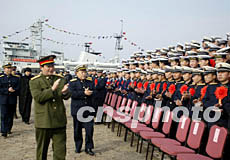 中央軍委授予海軍哈爾濱艦“海上先鋒艦”榮譽稱號命名大會二十六日在青島某軍港舉行。總政治部、海軍及艦隊領導看望哈爾濱艦官兵。作者:王松岐