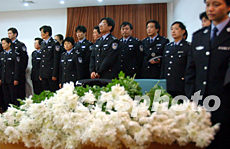 十二日中午,上海浦東“2·8”襲警案中受傷的警員陳衛國因傷勢過重,壯烈犧牲,他昔日的戰友紛紛來到追悼會場為英雄鮮花。作者:張宇