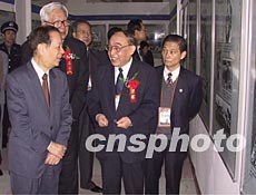 國務院副總理錢其琛(左一)、全國政協副主席羅豪才(左二),十五日在泉州饒有興致地觀看二十世紀華僑華人圖片展。作者:劉可耕