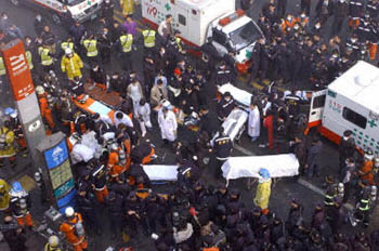 圖:韓國救援人員搶救地鐵縱火案傷員