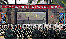 中國第一部全方位表現解放軍參加國際偵察兵軍事技能大比武的電視連續劇《世紀突擊》,二月二十二日在海南五指山某軍事基地開拍。圖為壯觀的開拍儀式。作者:古月