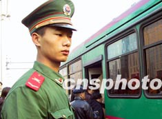二月二十六日,中國“兩會”即將召開,一名武警在北京巴士車站維持秩序。作者:杜洋