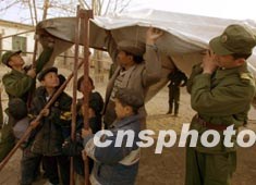 解放軍戰(zhàn)士26日在新疆地震災(zāi)區(qū)學(xué)校為孩子們搭建帳篷。因?yàn)榈卣穑貫?zāi)區(qū)的小學(xué)校已全部停棵,孩子們盼望早日開(kāi)學(xué)上課。作者:宋吉河