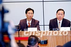 香港入境事務處處長黎棟國(右)與財經事務及庫務局首席助理秘書長劉應彬,3月11日在記者會上,就資本投資者入境計劃及輸入內地人才計劃答記者問。洪少葵 攝