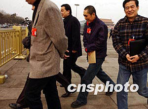 全國(guó)政協(xié)影視界的委員們掩護(hù)張藝謀將其掩護(hù)在中間,三月十三日快步走過(guò)天安門(mén)廣場(chǎng),去參加全國(guó)政協(xié)的選舉大會(huì)。作者:賈國(guó)榮