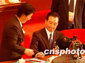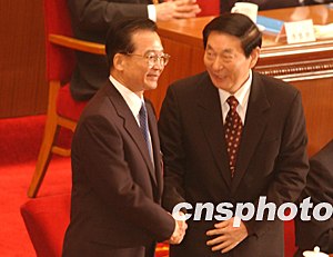 溫家寶和朱鎔基一同接受代表祝賀。作者:鄭萍萍