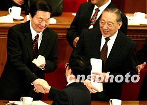 十屆全國人大一次會議十八日在北京閉幕,朱镕基、李嵐清握手和老友告別。作者:鄭萍萍