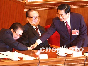 新當選的中國國家主席胡錦濤,三月十八日在十屆人大一次會議的閉幕式上,向九屆全國人大委員長李鵬握手致謝。作者:賈國榮