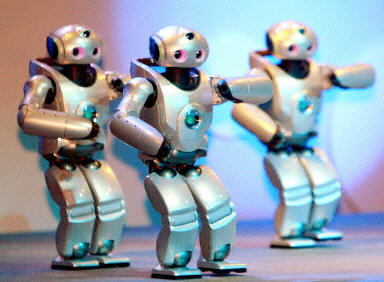 圖為日本索尼公司人形機(jī)器人SDR-4X II在“2003機(jī)器人展覽會”上展示跳集體舞技能。