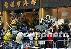 已故歌星張國(guó)榮設(shè)在香港殯儀館的靈堂于四月七日傍晚6時(shí)至8時(shí)開(kāi)放,眾多記者冒雨匯集殯儀館采訪。錢興強(qiáng) 攝