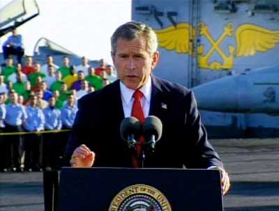在充滿感情的言辭中,布什不僅僅稱贊推翻薩達(dá)姆政權(quán)的美軍官兵,更是大講特講“9-11”恐怖襲擊,從而將伊拉克戰(zhàn)爭與反恐戰(zhàn)爭融為一體,布什用充滿感情的言辭說:“我們不應(yīng)該忘記9-11遇難的人們,不應(yīng)該忘記遇難者們打的最后一個電話,不應(yīng)該忘記孩子們慘遭冷酷的謀殺,不應(yīng)該忘記在廢墟中搜尋的日子。因為這些恐怖襲擊,因為恐怖分子和支持者們向美國宣戰(zhàn),所以他們也得到了戰(zhàn)爭的報應(yīng)。”布什還用強硬的措辭警告任何“與恐怖組織有關(guān),試圖擁有大規(guī)模殺傷性武器的無法無天的國家”,它們對“文明世界形成了嚴(yán)重的威脅,一定會遭到抵抗的。”布什這番話顯然是在直接警告伊朗等國家,并且暗示美國同樣敢對它們采取行動。