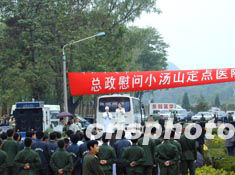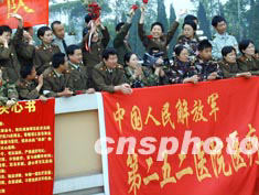 昨天中午我還在熟睡中就聽見戰友們歡呼著奔走呼應“走嘍!看節目去!”也真是的,來小湯山半個多月了,不但沒出去過也沒見過外面的人,真是憋壞了!這樣的熱鬧當然少不了我,我一骨碌爬起來沖了出去。天氣可真涼,剛出門口就連打了三個噴涕。十五點十分,演出還沒有開始,演員們已經在化妝準備了。一個排的武警官兵齊刷刷地坐在小板凳上板挺板挺的,嗨!比我還積極!十五點四十分演員們還在緊張地準備,我卻已經站不住了,天公實在不作美,不但刮著寒風還夾雜著星星雨點,我裹了件迷彩服還忍不住打哆嗦。可再看看演員們穿的比我還少,卻在熱火朝天地忙乎著,嘻,真是不好意思!