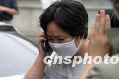 “非典”感染者、中國著名導演謝飛經過二十四天的治療五月十六日治愈出院,謝飛夫人崔女士在地壇醫院外等候時打電話問候即將出院的謝飛。中新社記者:盛佳鵬