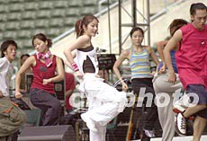 歌星梅艷芳5月23日出席香港大球場茁壯行動「1:99音樂會」彩排,梅艷芳身兼「1:99音樂會」總監在炎熱的天氣下,落力督導彩排。中新社傳真 鄧慶樂 攝