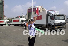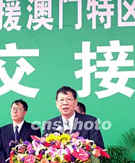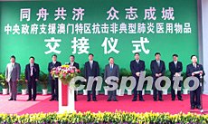 中新社澳門五月二十七日電(記者孫兆震)應澳門特區行政長官何厚鏵的請求,中央政府向澳門無償支援了一批抗擊非典型肺炎的醫用物品。今天上午在珠海拱北口岸,全國政協副主席、國務院港澳辦主任廖暉代表中央政府向何厚鏵送交了這批物品。