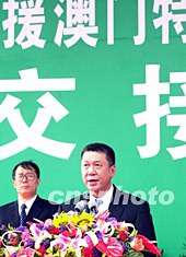 廖暉在交接儀式上說,在澳門周邊地區發生非典型肺炎疫情以來,胡錦濤主席、江澤民主席和溫家寶總理對澳門特區的情況非常關心。今天向澳門特區政府送交的這批醫用物品,是中央政府根據何厚鏵先生的請求對特區的無償支援,是中央政府關心澳門同胞的健康和福祉,全力支持澳門特區抗疫工作的具體體現。他表示相信,有偉大祖國的支持,有以何厚鏵先生為首的特區政府的堅強領導,有澳門各界人士的緊密團結、共同努力,澳門一定能夠奪取抗擊非典型肺炎的全面勝利,澳門各個方面的事業一定會有新的、更好的發展。