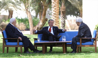 布什主持了巴勒斯坦自治政府總理阿巴斯與以色列總理沙龍之間的峰會,隨后結束就任總統(tǒng)兩年半來首次親自到中東進行謀和的訪問。