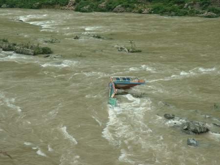 “響聲很大,很響。開始我還想這船怎么那學(xué)生來撞著玩呢。”羅安忠回憶說。船橫起來后不到兩分鐘,就折斷在礁石上了,船上的幾十名學(xué)生密密麻麻地幾乎全部掉進(jìn)水中,被湍急的河水沖洗走,只剩下一小部分人幸運(yùn)地站到河灘中間露出的礁石上面,等待施救。