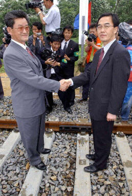 兩國鐵路連接于2000年6月15日簽訂協議,原定去年完成連接,但由于朝鮮的核計劃問題而推遲到今天。盡管鐵路已經聯起來了,但在火車通行前還要安裝電子和信號設備。