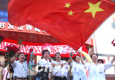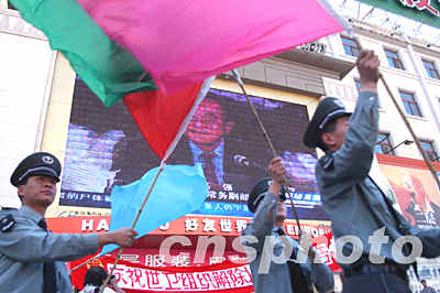 六月二十四日,世界衛(wèi)生組織撤銷對北京的旅行警告,并將北京從非典疫區(qū)名單中刪除。王府井街頭觀看直播的保安獲悉消息,揮旗相慶。 中新社記者:武仲林