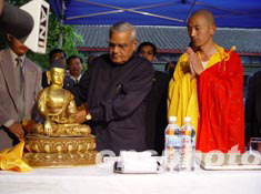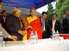 印度總理瓦杰帕伊二十五日參觀位于河南洛陽的“中國第一古剎”白馬寺,向白馬寺贈(zèng)送銅制鍍金釋迦牟尼佛像。作者:何曉聰