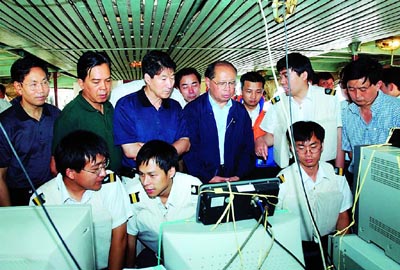 黃鎮(zhèn)東與市委常委、秘書(shū)長(zhǎng)何事忠,副市長(zhǎng)吳家農(nóng)、趙公卿一道,馬不停蹄地乘船趕赴現(xiàn)場(chǎng)。在船艙內(nèi),黃鎮(zhèn)東同國(guó)家安全生產(chǎn)監(jiān)督管理局副局長(zhǎng)閃淳昌等國(guó)務(wù)院事故調(diào)查組同志一道,認(rèn)真聽(tīng)取了事發(fā)經(jīng)過(guò)、施救情況和善后安排等情況的匯報(bào),并對(duì)下一步探測(cè)打撈工作提出了要求。黃鎮(zhèn)東一行還登上正在緊張作業(yè)的打撈船,看望慰問(wèn)探測(cè)打撈人員,對(duì)大家?guī)滋靵?lái)連續(xù)緊張的工作給予了肯定。在作業(yè)臺(tái)前,黃鎮(zhèn)東詳細(xì)詢(xún)問(wèn)了打撈公司的裝備、事故地點(diǎn)的水文特征、探測(cè)作業(yè)的最新進(jìn)展等,并要求探測(cè)單位鎖定重點(diǎn)水域進(jìn)行加密探測(cè),盡快確定沉船位置。打撈公司則要進(jìn)一步熟悉水情,科學(xué)論證,縝密部署,迅速制訂打撈方案,在確保安全前提下實(shí)施沉船打撈。他還特別叮囑要注意在打撈和搜尋中的安全,確保整個(gè)搜救工作萬(wàn)無(wú)一失。