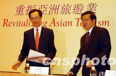 博鰲亞洲論壇秘書長龍永圖(右)、香港財政司司長梁錦松,六月二十六日在香港舉行記者會,公布“新形勢下的國際旅游合作大會──重振亞洲旅游業(yè)”的詳情。該會議將于七月十四日至十五日在香港舉行。中新社記者 潘索菲