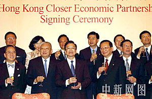 六月二十九日,在國務(wù)院總理溫家寶的見證下,商務(wù)部副部長安民及香港特別行政區(qū)財(cái)政司長梁錦松分別代表中央及香港在香港禮賓府簽署“香港與內(nèi)地更緊密經(jīng)貿(mào)關(guān)系安排”。中新社記者 潘索菲 攝