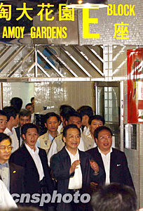 六月三十日,國務院總理溫家寶訪問香港社區淘大花園。淘大花園曾為SARS重災區。中新社記者 潘索菲 攝