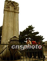 七月四日,中國北京明十三陵作為明清皇家陵寢的擴(kuò)展項(xiàng)目被列入世界文化遺產(chǎn)名錄,一時(shí)吸引不少游人前來參觀。圖為游客對十三陵中定陵前的石碑產(chǎn)生濃厚興趣,明十三陵每處皇陵前都有類似烏龜馱石碑的石雕。中新社記者 宋吉河 攝
