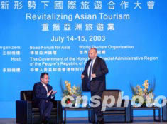 “重振亞洲旅游業會議”7月14日在香港舉行,行政長官董建華在致辭時表示,SARS對香港的影響看來只是短暫,香港經濟和旅游業正在復蘇,來自美加、日本及東南亞和內地的旅客開始回升。中新社記者:洪少葵