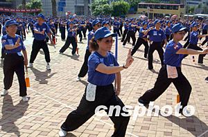 香港五百人頭頂烈日揮寫書法及耍太極劍。中新社記者:錢興強