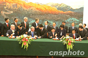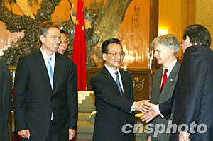 今天中午,中國總理溫家寶與來華訪問的英國首相布萊爾,在人民大會堂東大廳共同會見了英方隨行企業家。面對滿座英國的生意經高手,擅長用數字說明問題的溫家寶顯然遇到了“知音”。