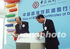 中國銀行(香港)21日在香港宣布推出四組港元及美元存款證,其中票面年息率最高為百分之三點四五。圖為該行副總裁林炎南(左)主持發行儀式。作者:裘之越